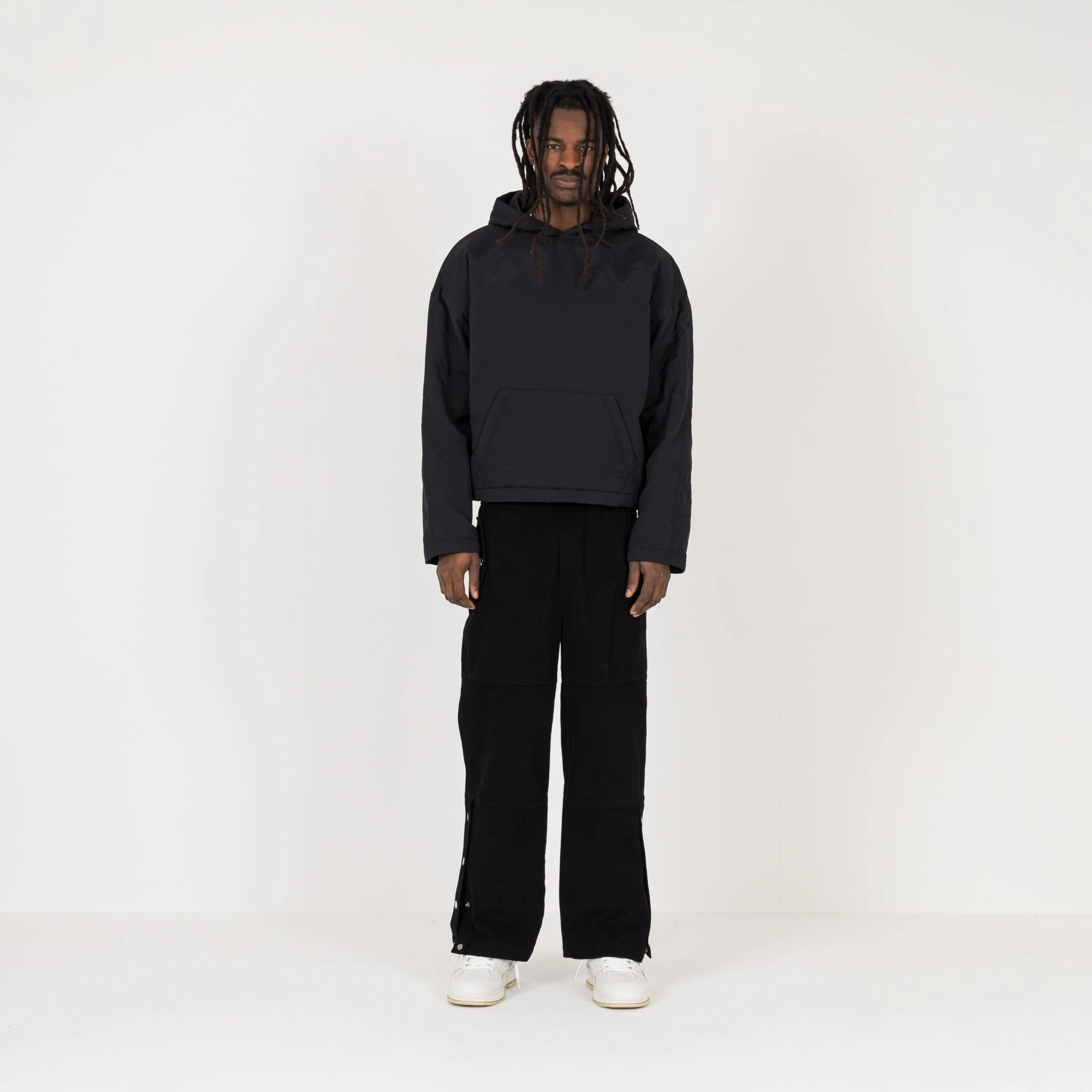 Fit: The relaxed, wide-leg design offers flexibility through the side poppers, allowing for either a straight or tapered leg. Their adaptable style pairs well with a range of footwear for any setting.