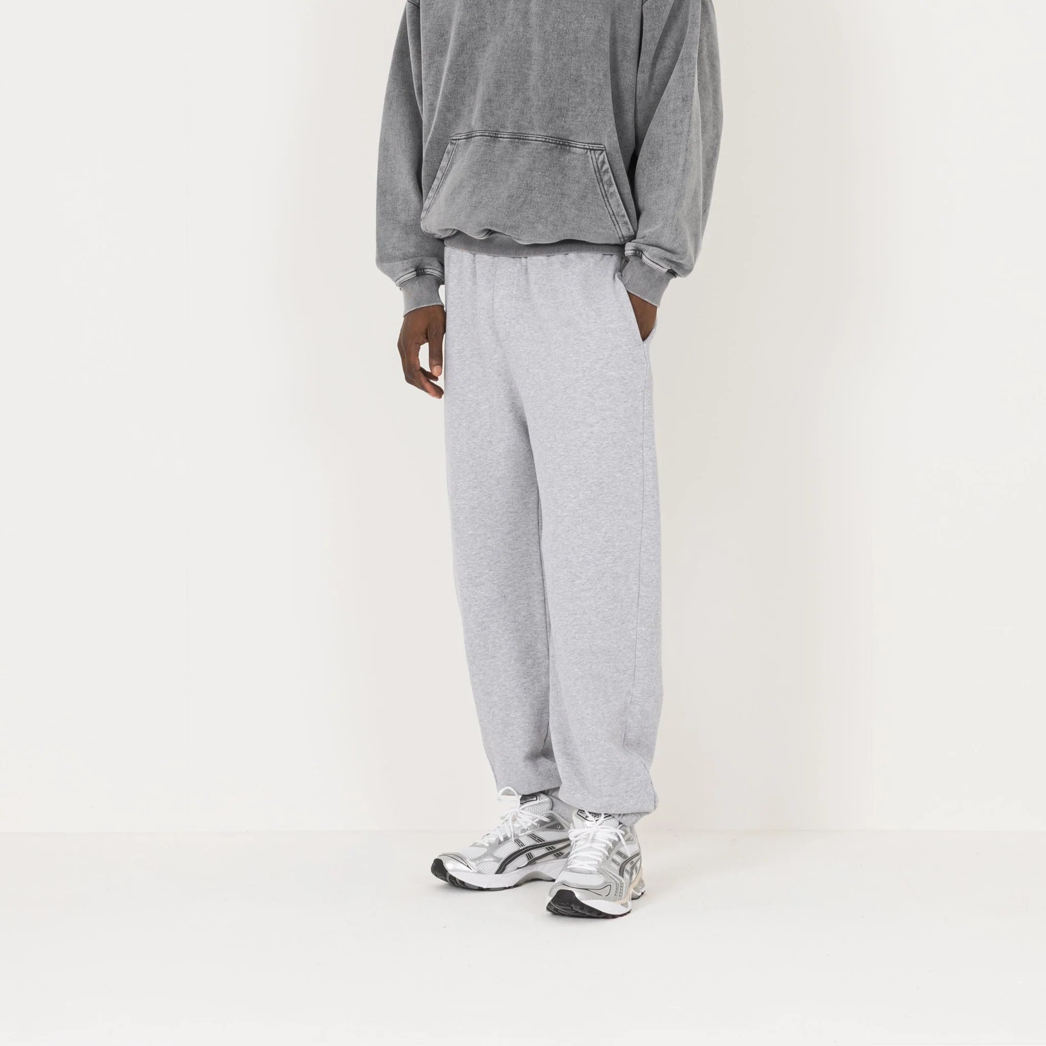 The relaxed leg is paired with an elasticated cuff that creates a natural stack over footwear without feeling tight or restrictive. Pre-shrunk for consistency over time.