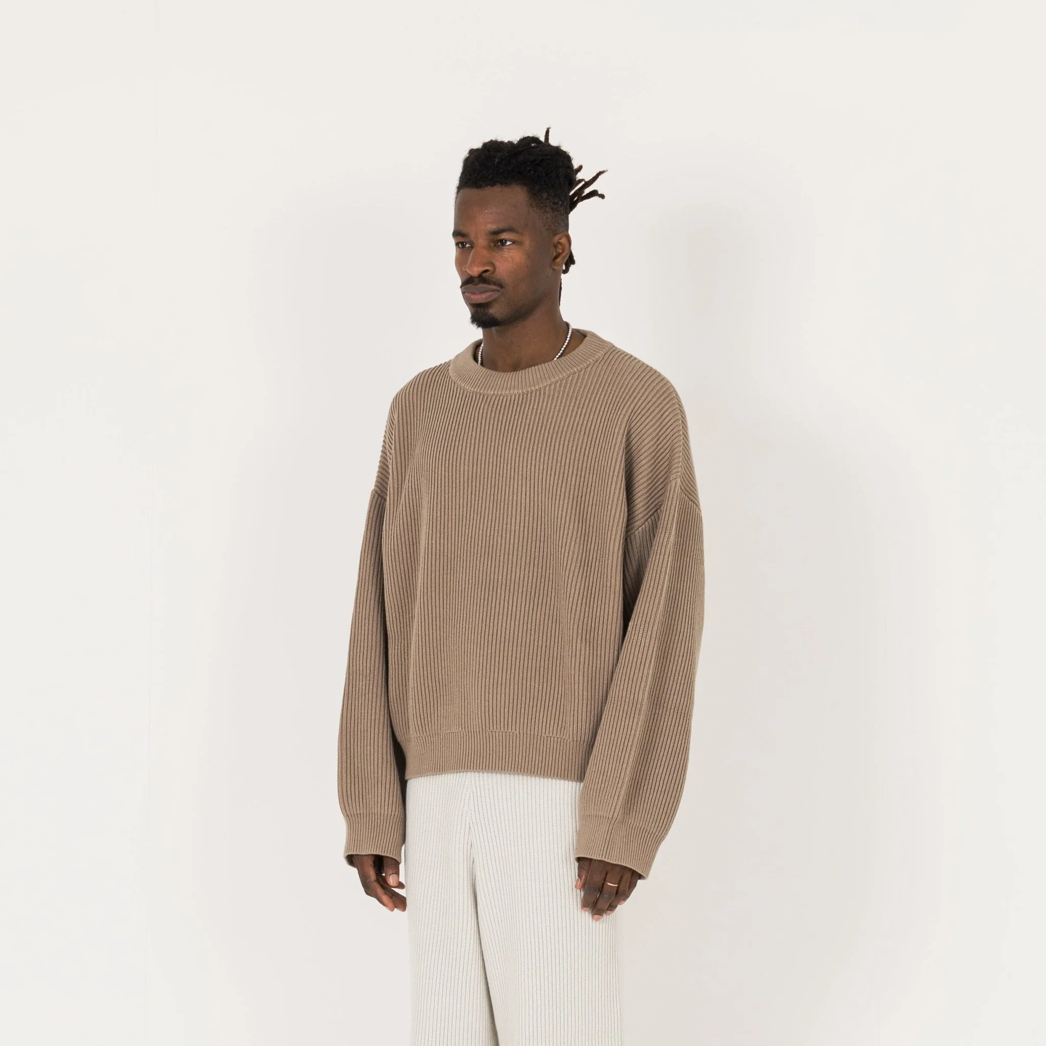 A textured essential with clarity. The Ribbed Sweatshirt is knitted from 100% cotton with a heavy vertical rib that holds shape while maintaining a natural drape. Weighty yet breathable, the fabric is built for repeated wear without losing form.