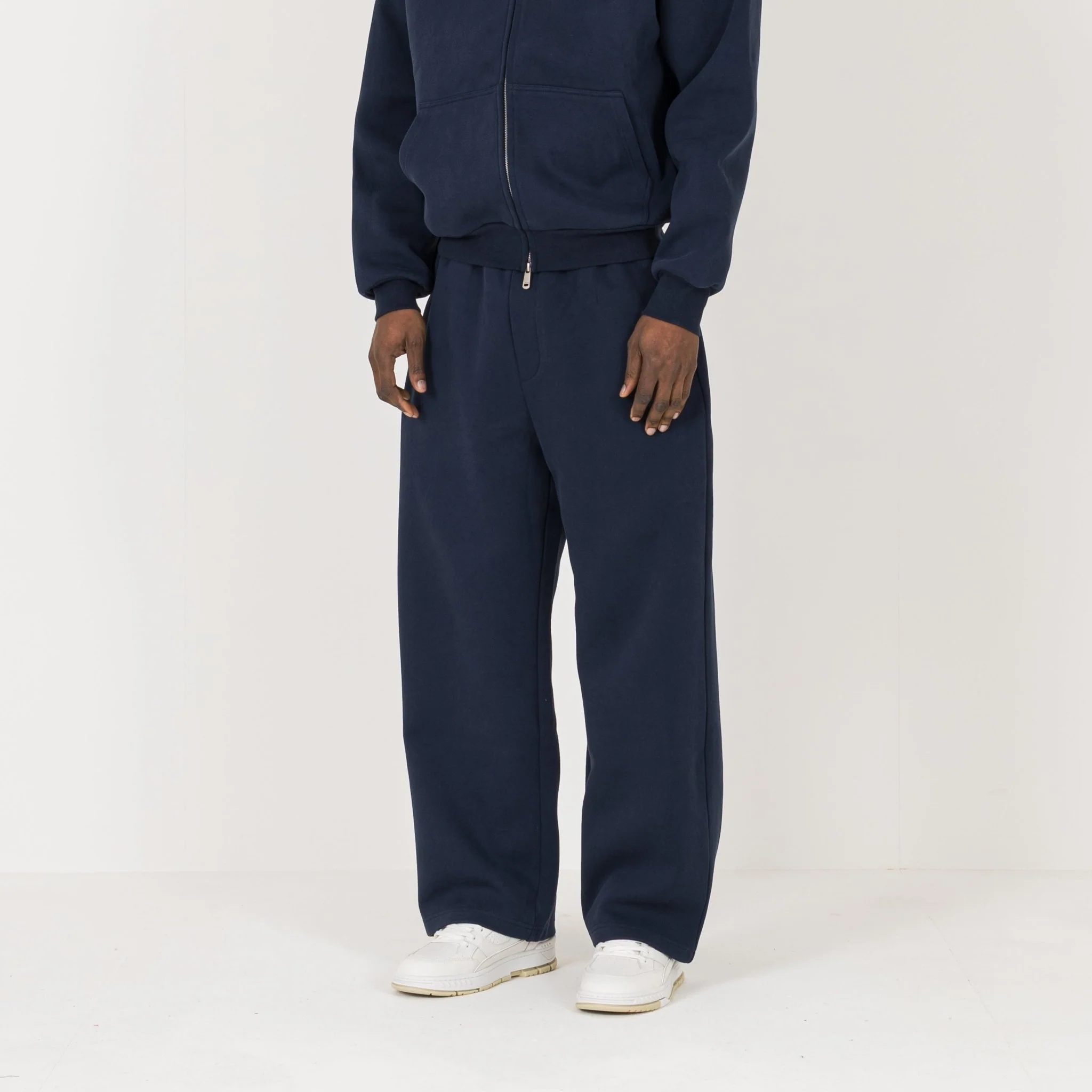 The fit is relaxed with a dropped rise and a wide, full length leg that stacks naturally over footwear. An elasticated waistband with an internal drawcord keeps the fit secure and adaptable without interrupting the line.